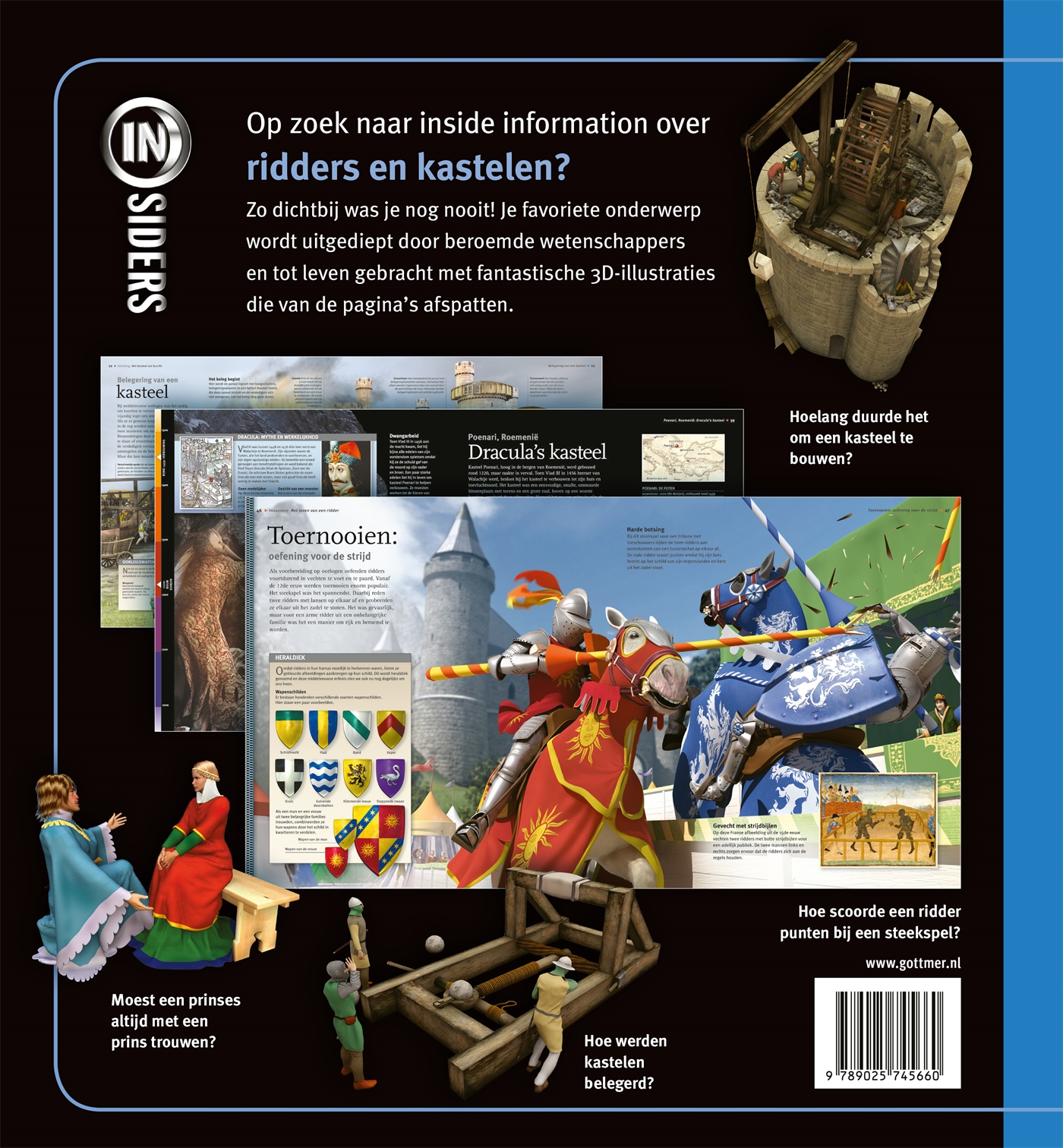 ‘Insiders Ridders en kastelen’ bevat alles wat je altijd al over ridders wilde weten. Naast Insiders Ridders en kastelen zijn er nog veel meer boeken in deze serie. Deze serie brengt alle favoriete onderwerpen op een verfrissende, moderne manier. Het indrukwekkende artwork, dat gecreëerd wordt met behulp van de modernste technologie, en de opvallende computerillustraties geven een duidelijk en realistisch beeld.