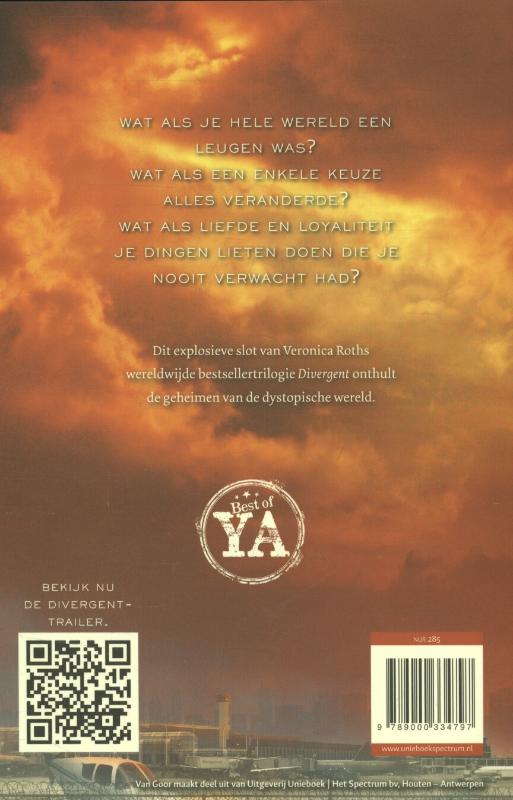 Wat als je hele wereld een leugen was?Wat als een enkele keuze alles veranderde?Wat als liefde en loyaliteit je dingen liet doen die je nooit verwacht had?Veronica Roth’s Divergent-trilogie begon met Inwijding en Opstand. Het explosieve slot Divergent 3 – Samensmelting onthult de geheimen van de dystopische wereld.